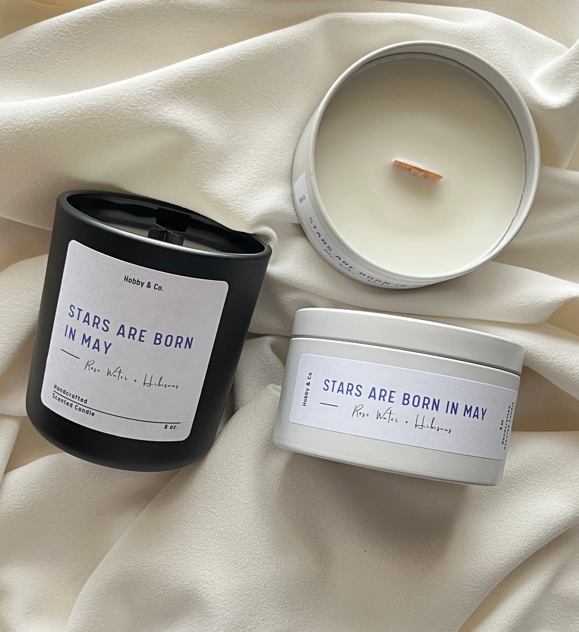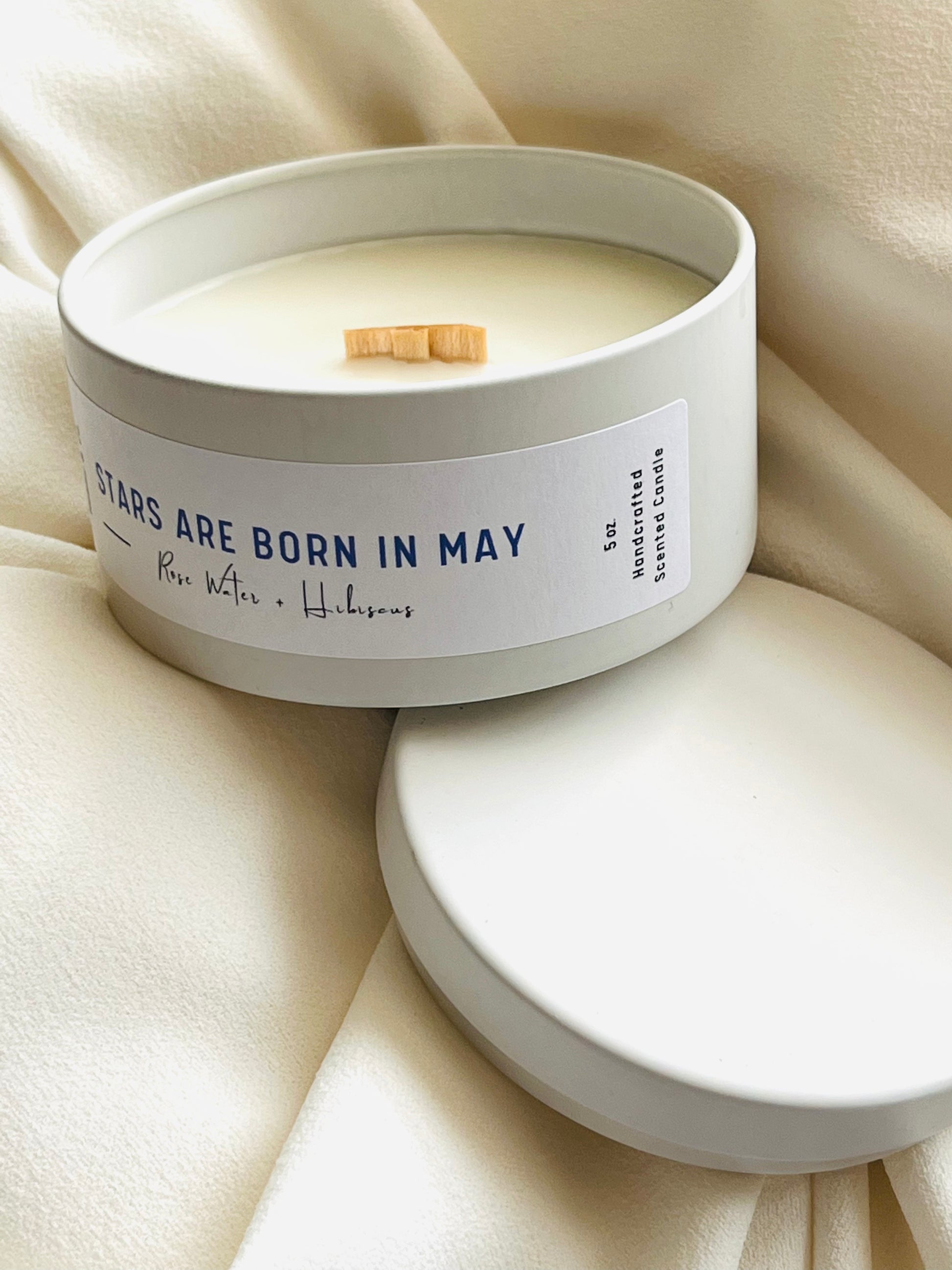 Stars Are Born in May is a floral tribute to the ones who blossom boldly—crafted with tender notes of rosewater and bright, tropical hibiscus. Light, airy, and effortlessly elegant, this candle captures the essence of spring’s softest blooms and the quiet confidence of a May soul.